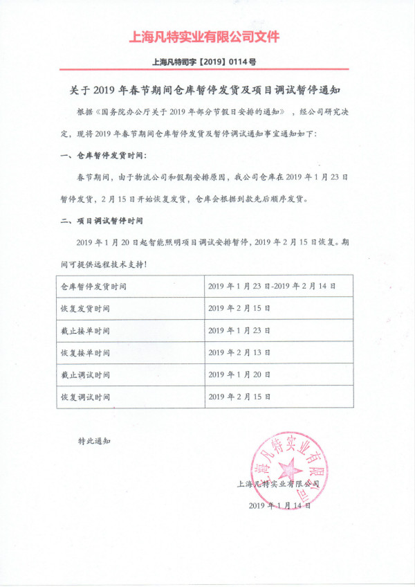 2019年春節(jié)期間暫停發(fā)貨、調試通知