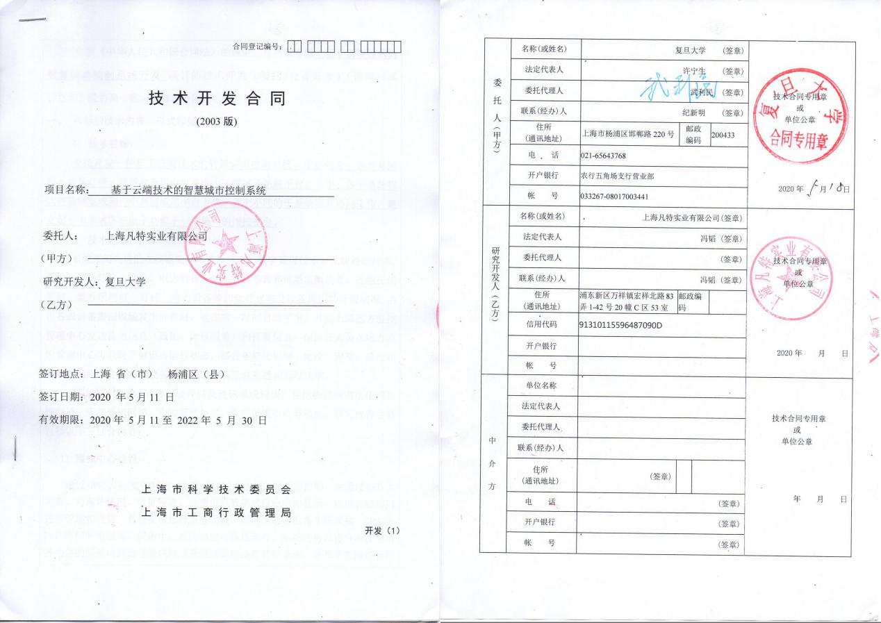 同年 5月11日,上海凡特實業(yè)有限公司正式與復旦大學簽訂《技術(shù)開發(fā)合同》——基于云端技術(shù)的智慧城市控制系統(tǒng)。項目將圍繞智慧城市開展科學研究、技術(shù)開發(fā)、成果轉(zhuǎn)化及文化交流等方面的合作。這次合作一面是能夠落實國家科教興國戰(zhàn)略,促進科技創(chuàng)新,加快企業(yè)經(jīng)濟發(fā)展,充分利用高等院校的技術(shù)、人力等資源以及先進成熟的技術(shù)成果。另一面,利用企業(yè)的生產(chǎn)條件,提高教學的科研能力,將科研成果盡快地轉(zhuǎn)化為生產(chǎn)力,不斷提升企業(yè)的技術(shù)和管理水平,雙方發(fā)展各自優(yōu)勢。上海凡特通過多種形式開展全面合作,共同推進公司與復旦學校的全面技術(shù)合作,形成專業(yè)、產(chǎn)業(yè)相互促進、共同發(fā)展,努力實現(xiàn)“校企合作、產(chǎn)學雙贏”!