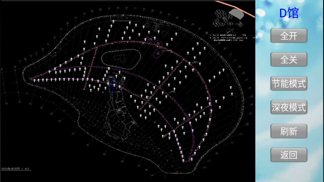 根據(jù)夏日晝長夜短、冬日晝短夜長的氣候特點以及開館、閉館的時間,預(yù)設(shè)燈光自動亮起、關(guān)閉的時間,避免忘關(guān)、漏關(guān)等現(xiàn)象;深夜客流量少時根據(jù)部分場館的需求可預(yù)設(shè)其所需的亮度(如下圖:深夜模式)