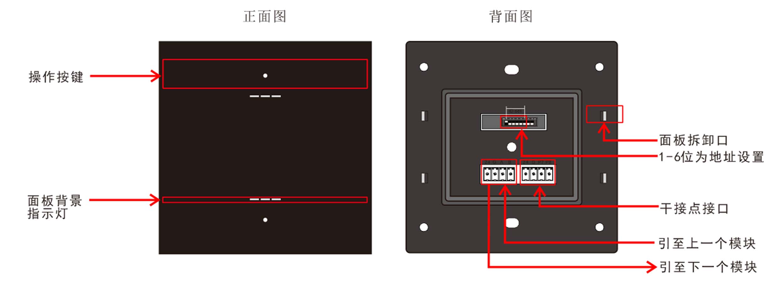 標準86底盒安裝,支持無縫聯(lián)接,提供2鍵,每個按鍵帶1路LED指示燈,復(fù)位式輕觸開關(guān),結(jié)構(gòu)成熟,性能穩(wěn)定,標準工藝,采用塑料材質(zhì)(顏色可選灰色、黑色和香檳金);自帶感應(yīng)式背光燈;提供兩路IO輸入可外接傳感器。
