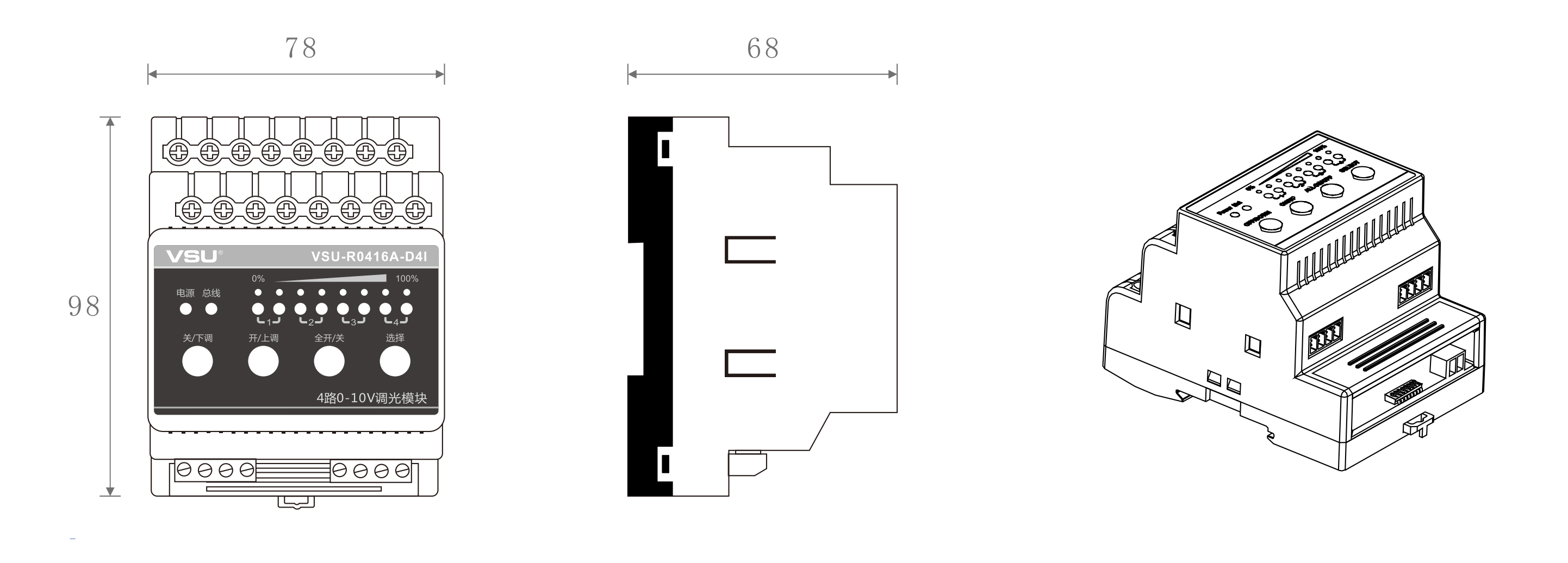 本產(chǎn)品為導(dǎo)軌式安裝,含4路智能繼電器可獨(dú)立控制4路3300W燈具的開(kāi)關(guān),4路0-10V調(diào)光接口配合0-10V調(diào)光變壓器可對(duì)日光燈、LED燈等燈具調(diào)光; |