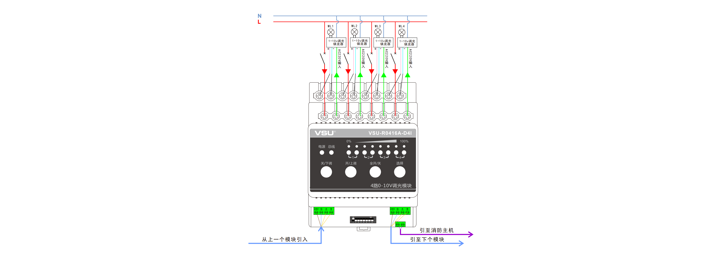 2,提供4路16A繼電器開(kāi)關(guān)和4路0-10V調(diào)光信號(hào);